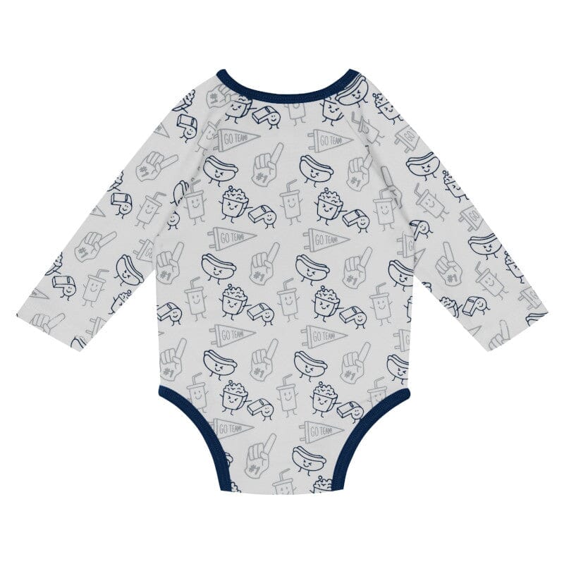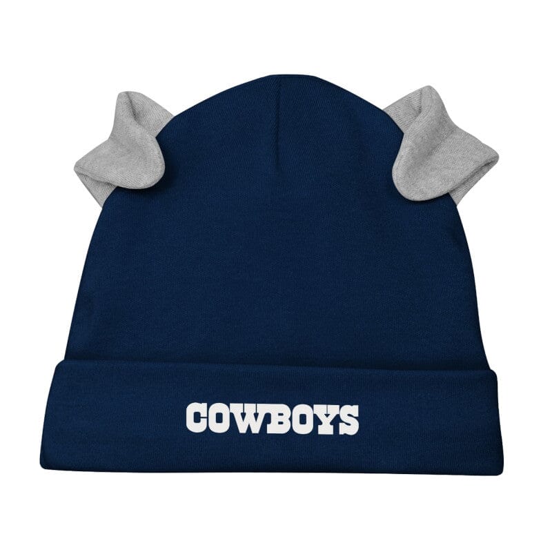 Your little fan can gear up for the season in this adorable Dallas Cowboys baby outfit! Made from 100% cotton, it's perfect for your baby's sensitive skin. The long sleeve bodysuit features convenient leg snaps for easy changes, while the comfort-stretch waistband on the footie pants ensures a snug yet comfy fit. Topping off the look is a matching navy cap, complete with small gray ears, adding a playful touch to your future Cowboys star. Perfect for game day or everyday wear, this outfit will have your baby cheering in style!