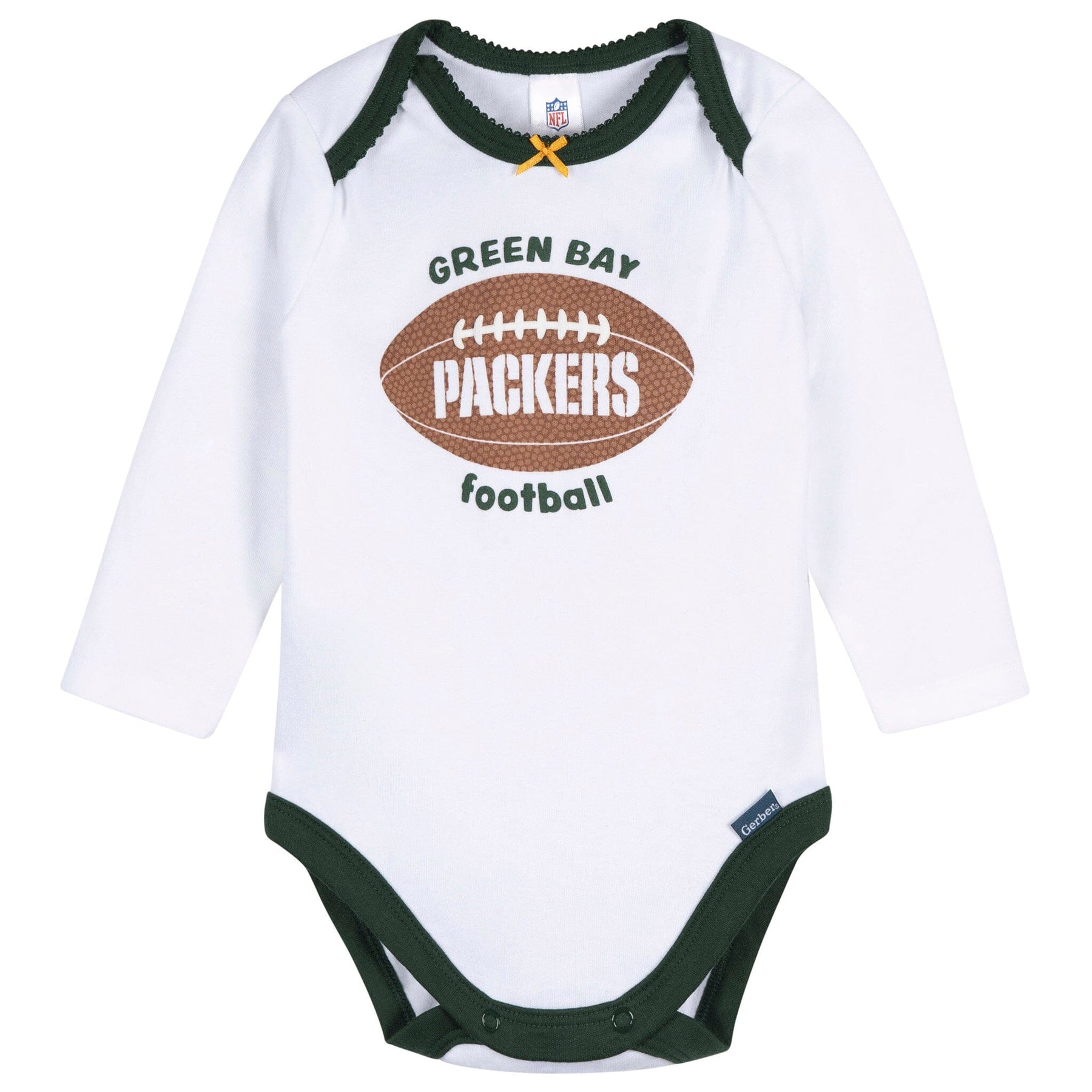 Football fun starts early in this adorable Packers outfit designed just for baby girls. The long sleeve bodysuit is made from soft, thick interlock fabric and features bold puff print graphics. Lap shoulders and leg snaps make for easy outfit swaps, while the pull-on pants and matching satin bow headband complete the team-ready look. Perfect for chilly fall games and everyday play!