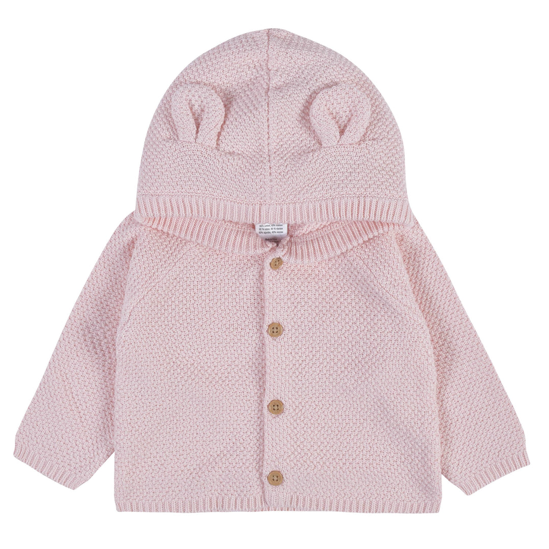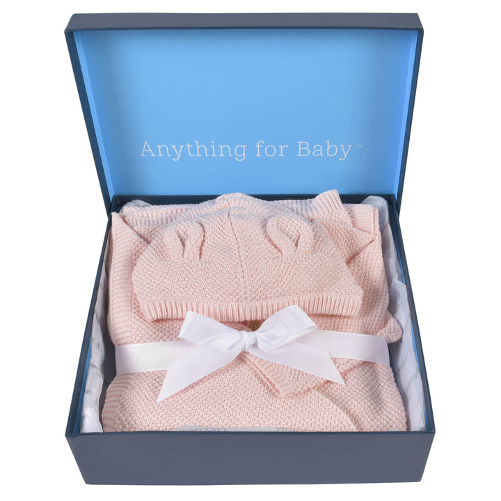 Keep your little one warm and snuggled with our adorable 3-piece sweater knit set. Each piece in this baby girl set is made with mos stitch sweater knit fabric, super soft and comfortable on your little one’s skin. We had our essentials independently certified with STANDARD 100 by OEKO-TEX® so that you don’t have to worry about harmful substances in your baby’s wardrobe. Each piece of baby clothing is designed with easy on/off features to keep changes quick and convenient. The hooded sweater top features faux wood buttons and adorable 3D ears on the hood. The footed pants feature 3D ears on the feet and a gentle elastic waistband. The blanket is sized at 30” x 40”, a wonderful size for cuddling your little one. This set is perfect to give as a baby shower gift and comes packaged in a precious gift box. Each piece is machine washable and machine dryable for your convenience.