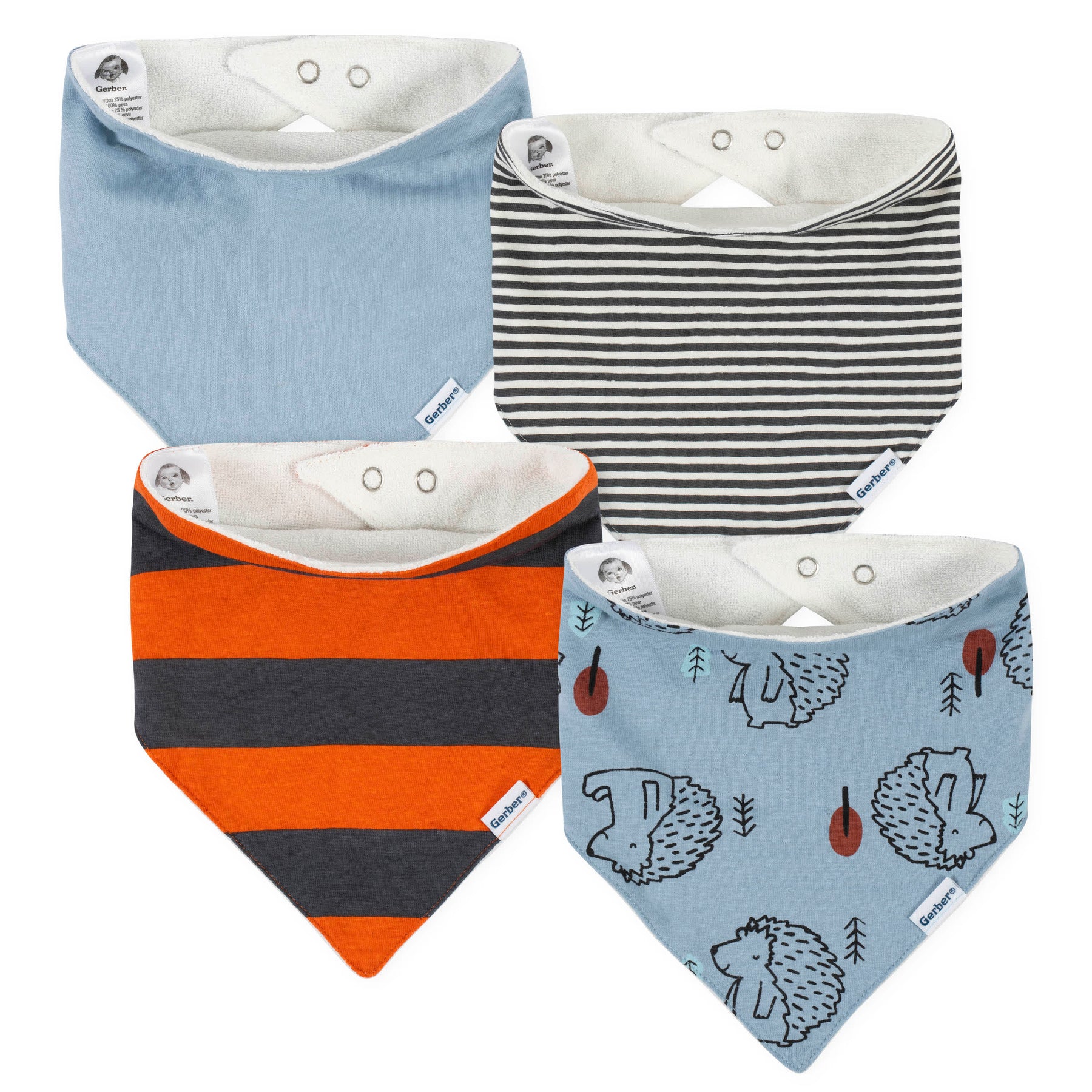 - Includes four bandana bibs