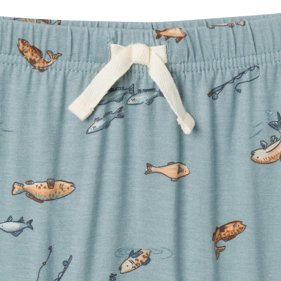 • Medium teal with fishing print and solid light green, faux drawstring