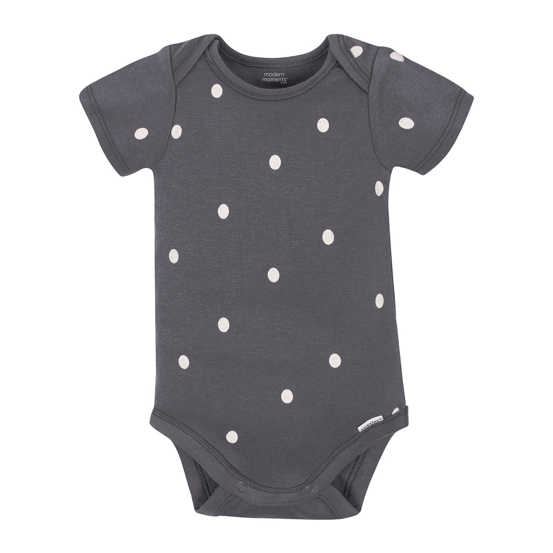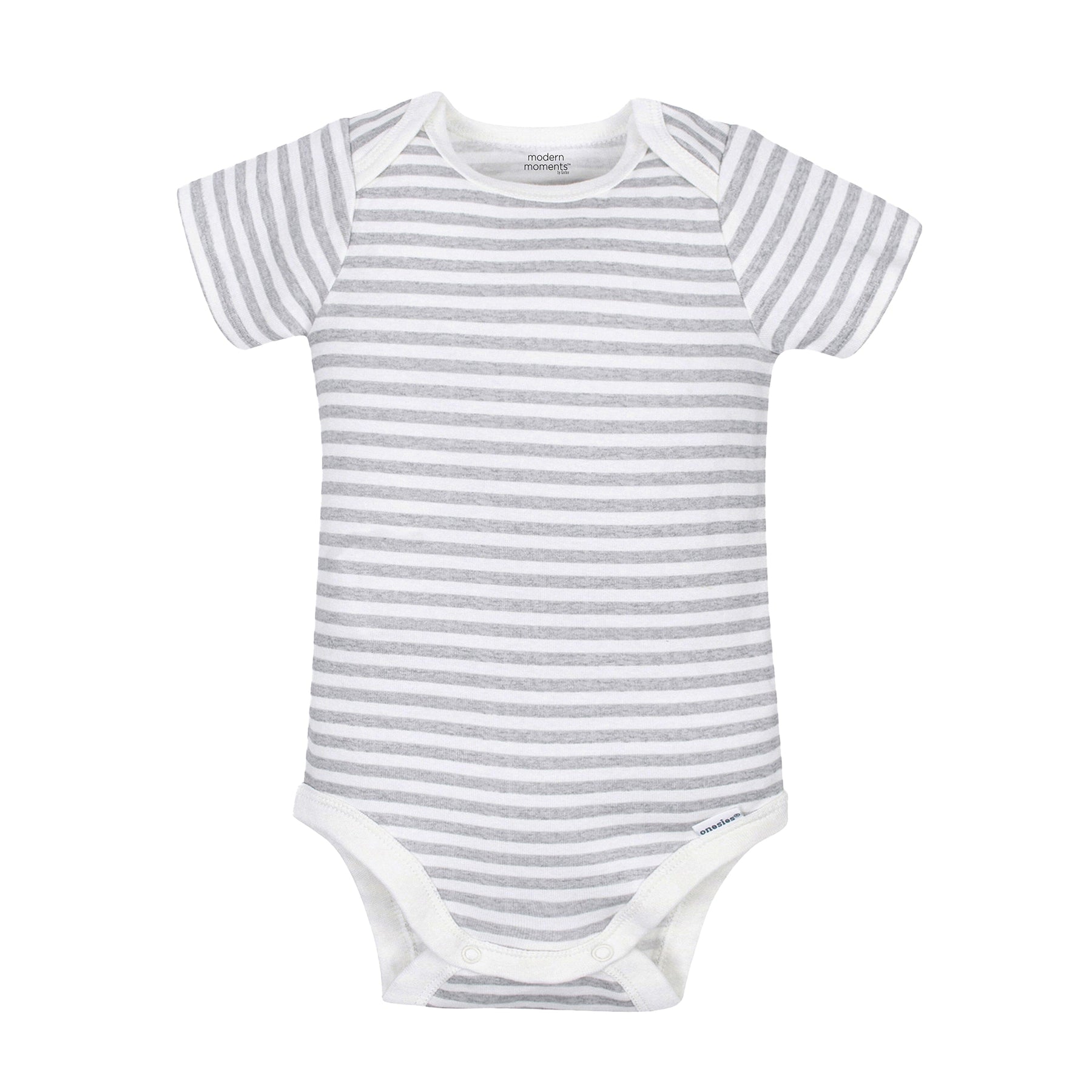 Our Onesies® bodysuits are perfect to mix and match with their favorite shorts, pants and accessories. Each baby boy bodysuit is made with super soft cotton fabric blended with a touch of spandex. Our essentials have been independently certified with STANDARD 100 by OEKO-TEX® so that you don’t have to worry about harmful substances in your baby’s wardrobe. This set includes four short sleeve Onesies® bodysuits in a gray color scheme with striped, floral, and polka dot patterns.