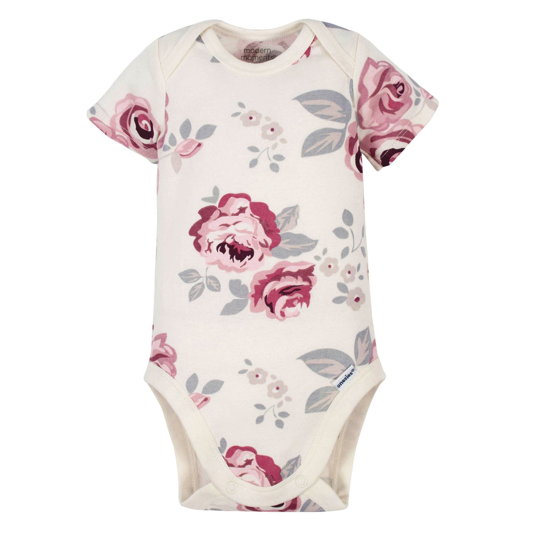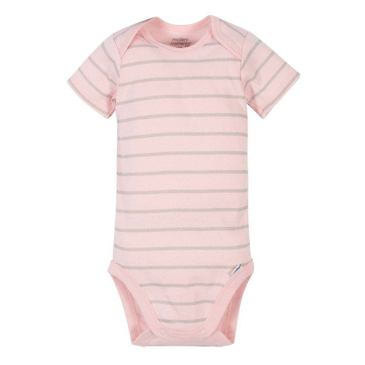 Modern Moments by Gerber. Modern sophistication and style with the quality and value you expect from Gerber. Add a modern flair to baby’s wardrobe with this 4-pack of stylish and practical solid pink, floral, and striped Onesies® bodysuits. The short sleeve Onesies® bodysuits will keep baby comfortable all day long. These baby girl Onesies® bodysuits are made with cotton and spandex jersey. The baby soft fabric is gentle on baby’s delicate skin and provides the perfect amount of stretch. These bodysuits are OEKO-TEX® certified to give you peace of mind that no harmful substances will touch your baby’s skin. Pair these baby girl bodysuits with any Modern Moment stylish accessories to create a fashionable and functional outfit. They feature expandable lap shoulder necklines and high-positioned bottom snaps for easier changes. Your baby will love the supreme comfort of these high-quality outfits and you’ll love her smart style. If you love snapping photos of your little one, these baby bodysuits will add to her cute looks. Plus, the bodysuits are easy to clean and care for. When they need to be washed, they may be run safely through the washer and dryer, time and time again, without compromise. Give these easy-to-change baby outfits to any little fashionista you know and love as a thoughtful, practical gift that’s sure to enhance baby’s wardrobe.