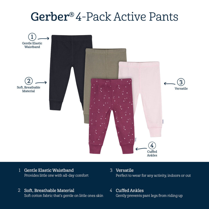 Add a touch of comfort and charm to your little one’s wardrobe with this 4-pack of baby girls’ active pants! Made primarily from soft cotton with a hint of spandex, these pants provide a flexible fit that moves with your baby. The comfort-stretch waistband makes dressing a breeze, while cinched ankles keep the pants securely in place through every wiggle and crawl. Designed with stylish vertical ribbing for a cute, textured look, this set comes in a lovely mix of green, blue, and pink. Pair them with bodysuits or t-shirts for effortlessly adorable outfits, perfect for playtime, nap time, and beyond! Our essentials have been independently certified with STANDARD 100 by OEKO-TEX® so that you don’t have to worry about harmful substances in your baby’s wardrobe. Pack includes four active pants.
