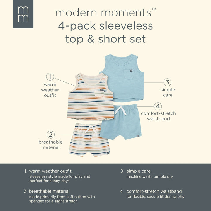 Brighten up his wardrobe with this modern moments™ baby boy outfit set, perfect for sunny days! Made primarily from cotton with a hint of spandex, the sleeveless shirt and comfy shorts move with him as he plays. The comfort-stretch waistband keeps the shorts secure for all-day fun, while the pack includes a delightful mix of solid colors and fun prints for easy outfit options. The faux drawstring detail on the shorts adds a charming touch to his everyday look. Our essentials have been independently certified with STANDARD 100 by OEKO-TEX® so that you don’t have to worry about harmful substances in your baby’s wardrobe. Pack includes two shirts and two matching shorts.