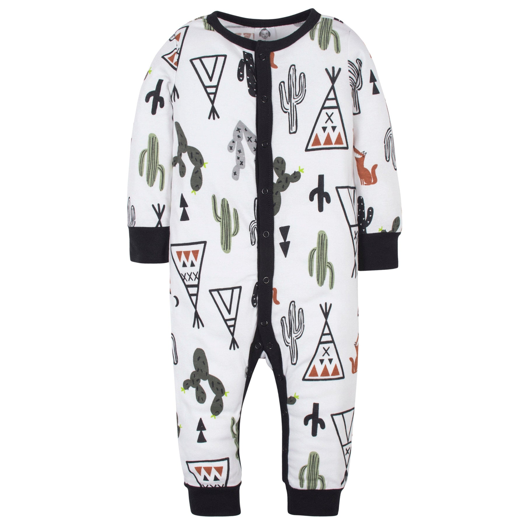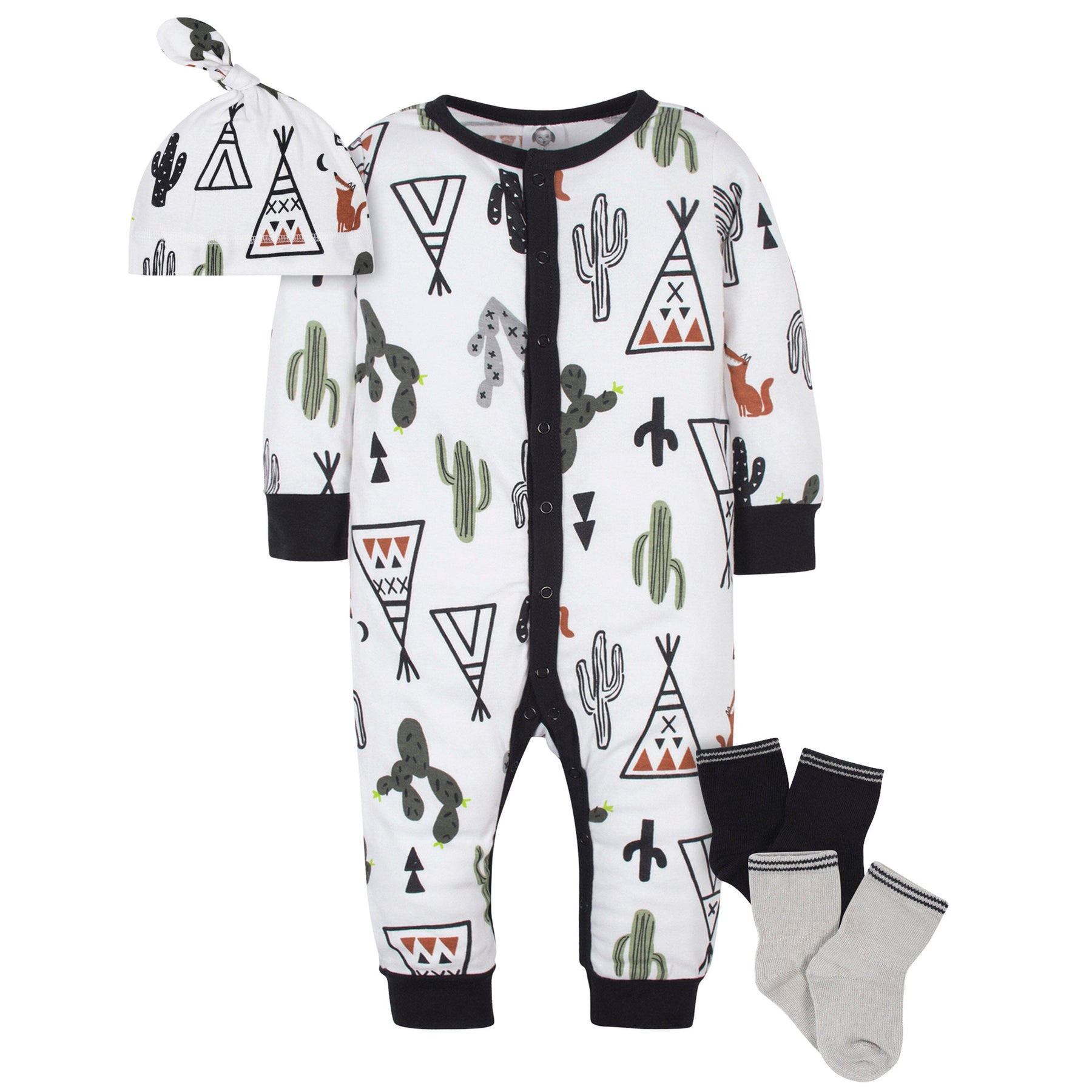 Modern Moments by Gerber®. Modern sophistication made with the quality and value you expect from us. Add a modern flair to your baby’s wardrobe with our stylish and practical coveralls sets. The coveralls feature snaps down the front and on the inner thighs, so changes are simple and quick. These coveralls feature mitten cuffs (in sizes newborn and 0-3 months) to prevent accidental scratches on your baby's sweet face. The socks features Wiggle-Proof™ technology that holds them comfortably in place without leaving marks. We had this set independently certified with STANDARD 100 by OEKO-TEX® so that you don’t have to worry about harmful substances in your baby’s clothing. The soft fabric is made with cotton with organic fibers to provide a healthy planet and happy baby. Give this set as a thoughtful gift at the next baby shower you attend. Each piece is machine washable and dryable for your convenience.