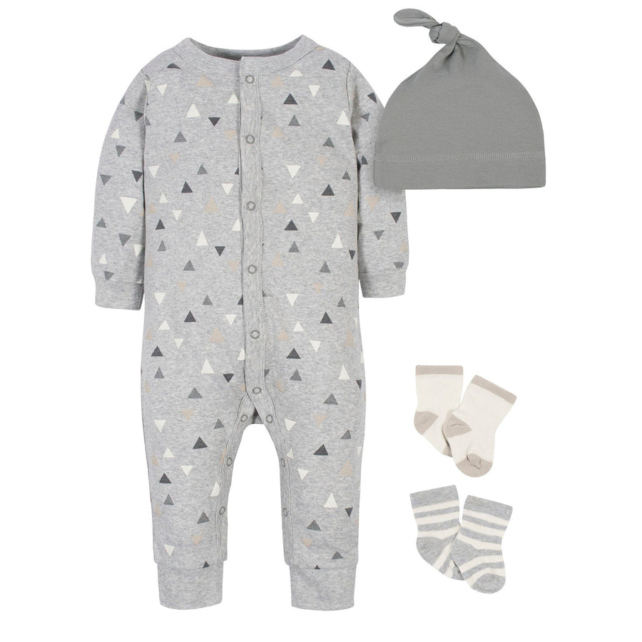Modern Moments by Gerber. Modern sophistication and style with the quality and value you expect from Gerber. This set includes one gray triangle print coverall, one solid gray cap, and two pairs of socks. Add a modern flair to baby’s wardrobe with these stylish and practical garments. These garments are made with organic cotton and spandex jersey. The baby soft, earth-friendly fabric is gentle on baby’s delicate skin and provides the perfect amount of stretch. These baby clothes are OEKO-TEX certified to give you peace of mind that no harmful substances will touch your baby’s skin. The coverall features snaps down the front and inner thigh snaps for easy wardrobe and diaper changes. The socks have Wiggle-Proof technology to keep them held comfortably in place without leaving marks. Mix and match these baby boy clothes for stylish, handsome outfits. Baby will love the supreme comfort of these high-quality items and you’ll love his smart style. If you love snapping photos of your little one, these clothes will add to his cute looks. Plus, the baby boys’ coveralls and accessories are easy to clean and care for. When the clothes need to be washed, they may be run safely through the washer and dryer, time and time again, without compromise. Give these easy-to-change outfits to any little fashionista you know and love as a thoughtful, practical gift that’s sure to enhance his wardrobe. Gerber provides high-quality products that parents can trust to be better for baby as well as better for the planet.