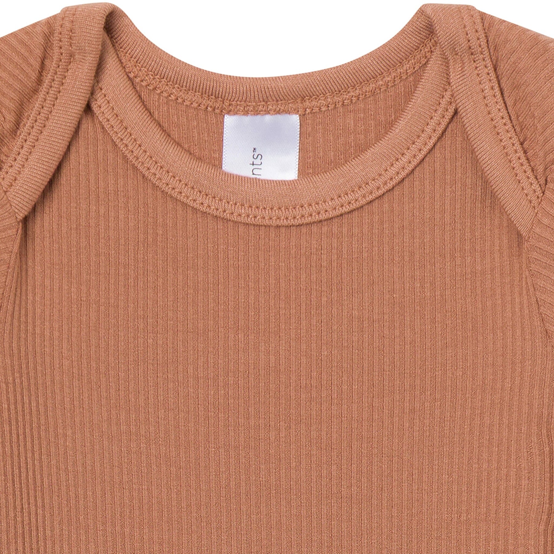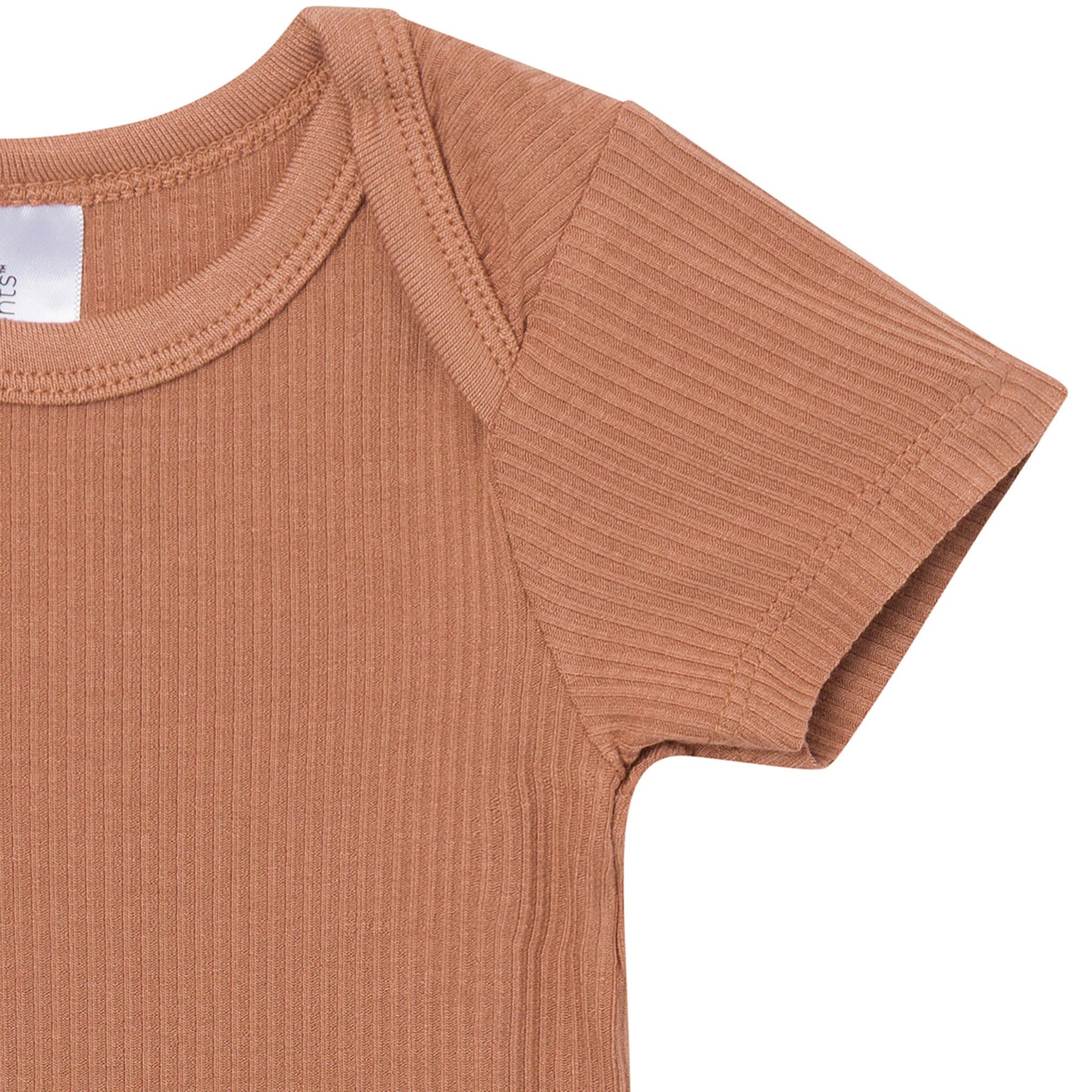 Soft and made to move, this 4-piece baby boy outfit set is a go-to for all-day comfort and playful style. It features two short-sleeve bodysuits and two pull-on pants, all made from a stretchy viscose blend designed to flex with every scoot and snuggle. A charming prancing horse print adds whimsy to one off-white bodysuit, while the coordinating solid brown set delivers a polished, ribbed finish. Thoughtful details like lap shoulder necklines, quick-change leg snaps, and stay-put waistbands help simplify dressing while keeping baby comfy from morning to night. Our essentials have been independently certified with STANDARD 100 by OEKO-TEX® so that you don’t have to worry about harmful substances in your little one’s wardrobe.
