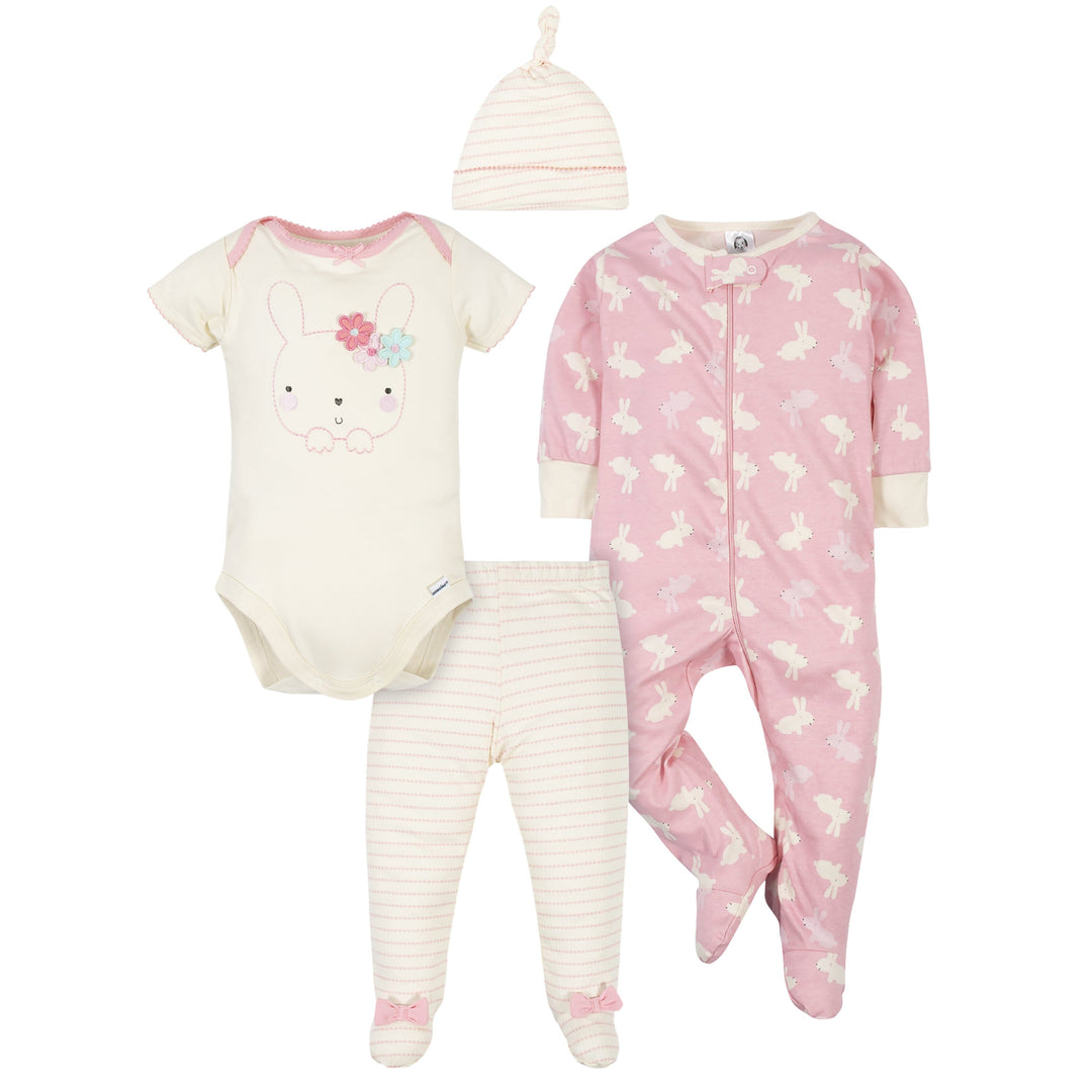 Our 4-Piece Take-Me-Home Sets are the perfect gift for your littlest loved one. Each set includes one footie, one short sleeve Onesies® Brand bodysuit, one footed pant, and one cap. These sets are made with soft cotton interlock with organic fibers for a happy baby and healthy planet. Our Onesies® Brand bodysuit features an expandable lap shoulder neckline and high-positioned bottom snaps to make changes as simple as possible for parents and caretakers. The footie features a front zipper with a safety tab that prevents baby’s sweet chin from being poked and irritated, and the cap features a soft cuff. The pants are made with a gentle elastic waistband to keep baby’s kissable tummy comfortable all-day long and will keep changes simple. Plus, the footed design keeps you from fussing over baby socks. This 4-piece set will quickly become a favorite! Each piece in this set is machine washable and machine dryable.