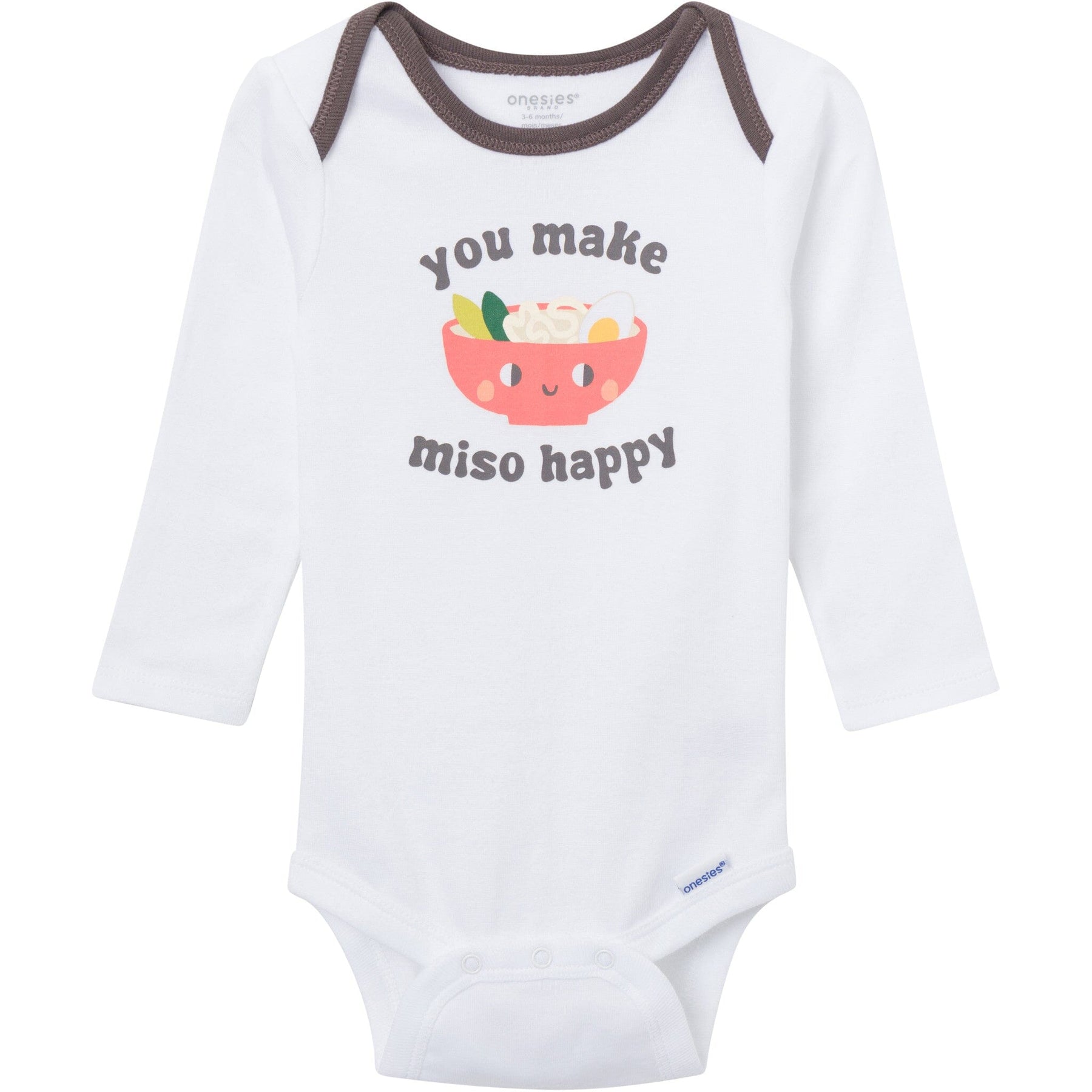 Serve up some smiles with this adorable “Miso” outfit set—perfect for your little foodie! Featuring a playful sushi print and a sweet “You Make Miso Happy” graphic, this 4-piece mix-and-match combo includes two long-sleeve bodysuits and two cozy pants. Made from 100% cotton to keep baby comfy and gentle on sensitive skin, each bodysuit includes lap shoulders and leg snaps for quick changes. The comfort-stretch waistband on the pants makes dressing super easy, whether you’re heading out or staying in for snuggles. Our essentials have been independently certified with STANDARD 100 by OEKO-TEX® so that you don’t have to worry about harmful substances in your baby’s wardrobe. Includes two Onesies® bodysuits and two matching pants.