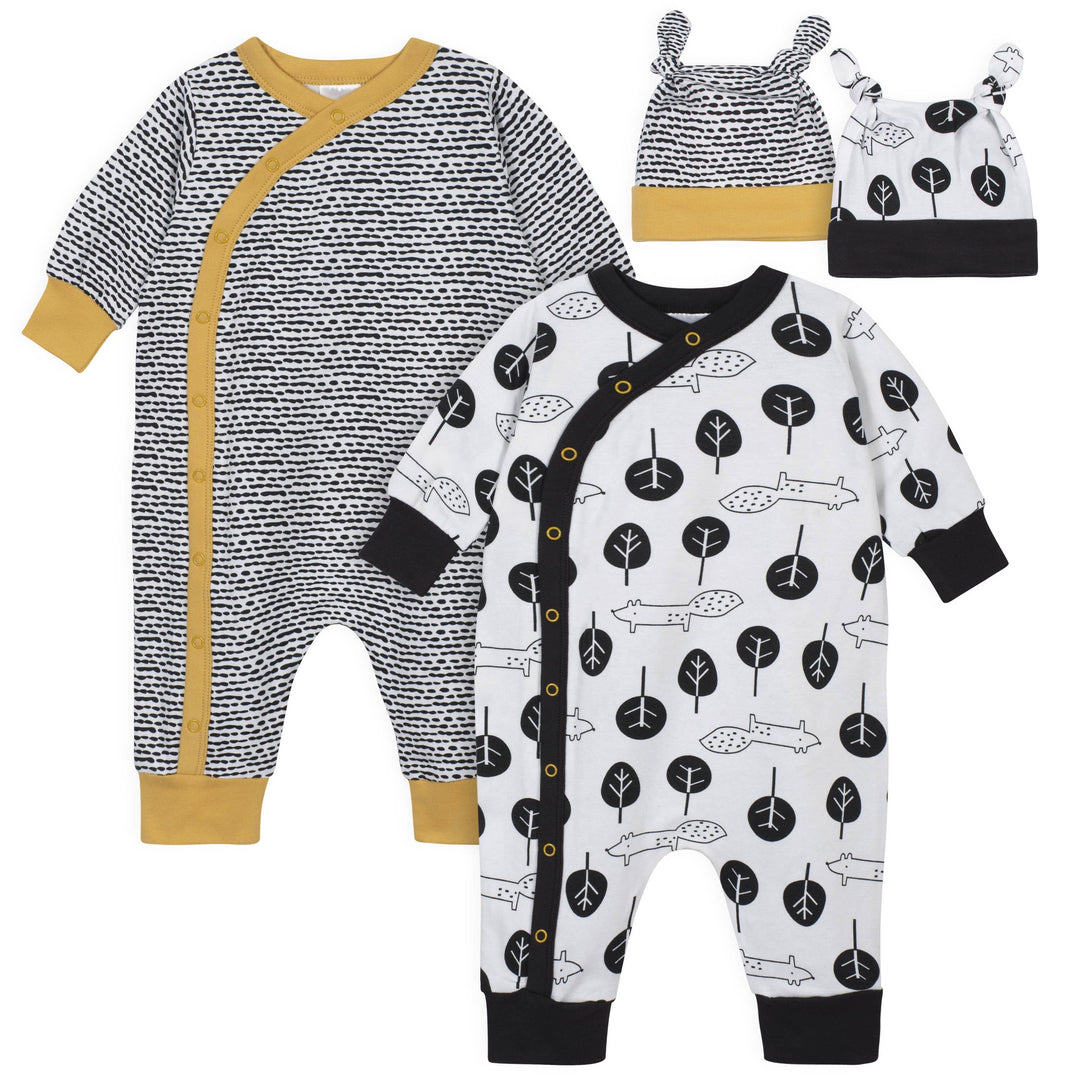 Gerber coveralls are the ultimate footless pajamas baby is sure to love! This four-piece set includes two coveralls and two caps. These soft rompers are made with cotton and spandex blended fabric, a comfortable fabric thats perfectly breathable to prevent irritation against babys delicate skin. This baby outfit is appropriate to use as newborn pajamas as theyre made to comply with all safe sleep standards. The coverall features snaps down the front of the outfit to allow for easy and fast diaper changes. This makes the baby sleeper incredibly easy to put on as well as to take off. The baby boy hat features a soft cuff for comfort. The coordinating baby cap is perfect to add some warmth to any outfit! The baby sleeper is perfect to add extra warmth which is wonderful for sleepy time as well as if there is a chill in the air. These footless pajamas kids will love to wear to bed because of the supreme comfort as well as cute and fun patterns. Available in assorted colors and patterns, this two-piece set is suitable to use as a baby boy sleeper. Baby will love the comfortable feel and parents love how cute baby looks! But this coverall and cap set isnt just for sleep! Its a wonderfully comfortable, casual outfit to wear during the day. This two-piece set allows babies mobility and provides warmth. This set is perfect for play but is also cute enough to be worn out on the town! This outfit is perfect to wear on a stroll outside, to the grocery store, to day-care, or to grandma and grandpas house! The possibilities are endless! The versatility of this two-piece set truly gives them a spectacular value that all parents will appreciate. The coverall and cap set makes an excellent gift for any baby boy you know and love! Gerber provides high-quality products that are easy and convenient for parents as well as cute and comfortable for baby. Gerber provides safe products that parents can trust.