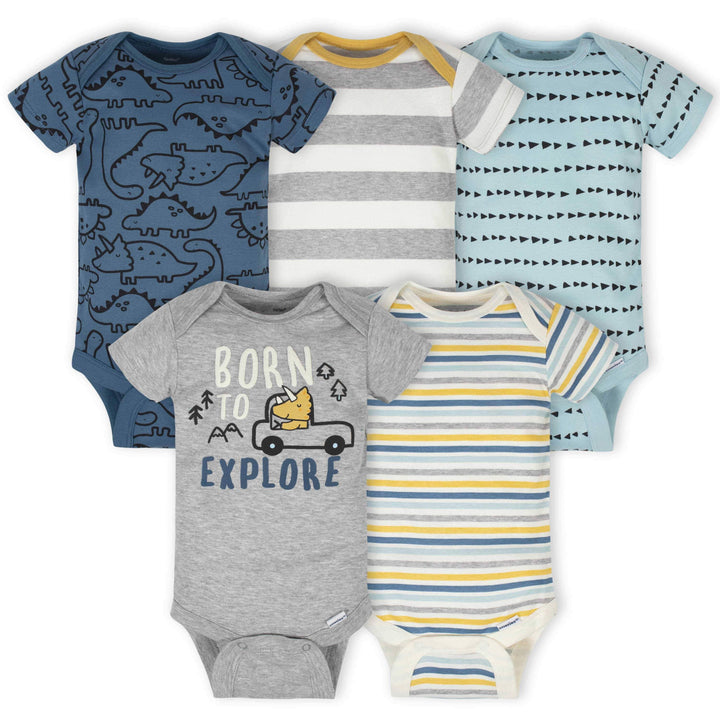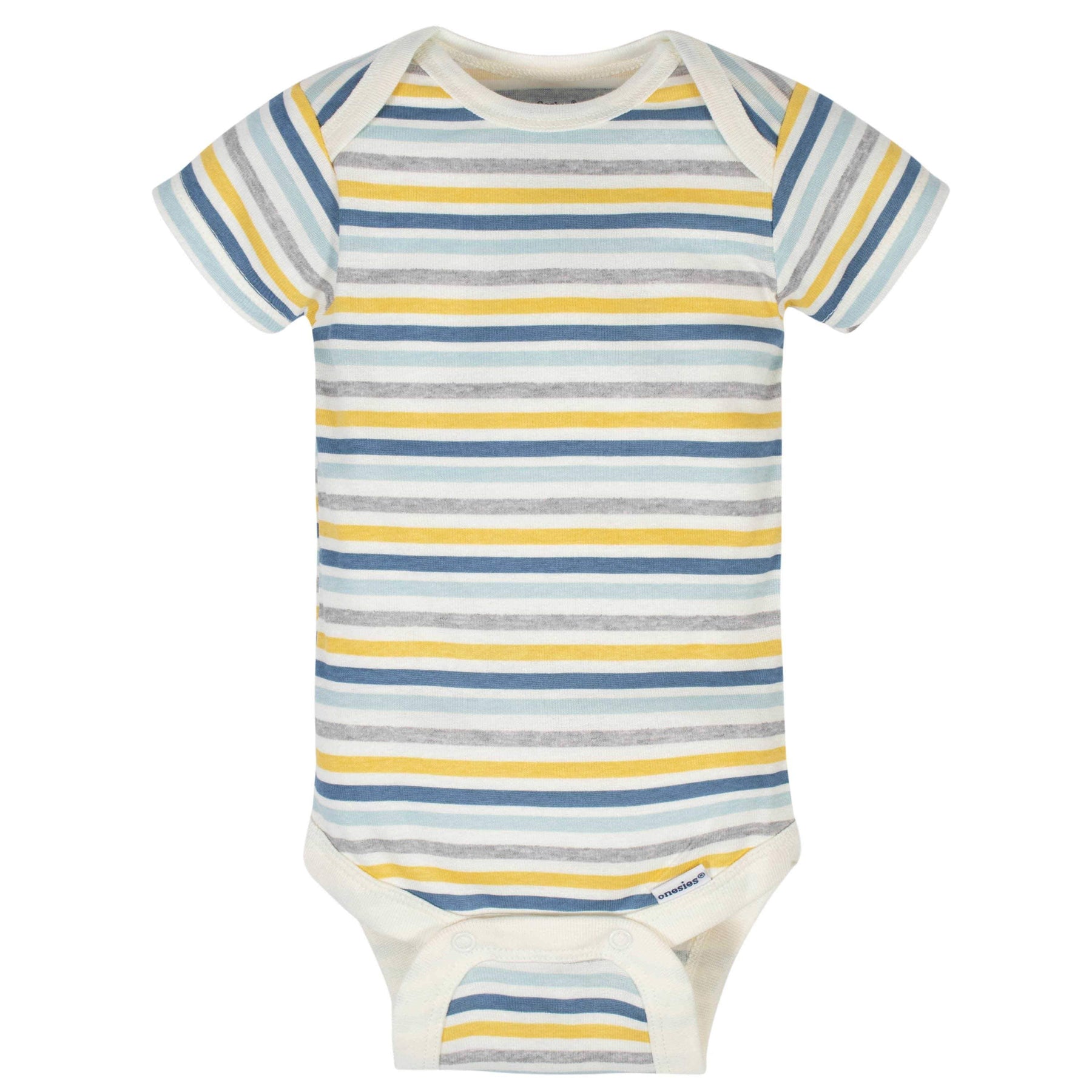 Baby Onesies® bodysuits are essential part of baby’s wardrobe! These adorable, assorted Onesies® bodysuits are made with a soft cotton fabric that’s perfectly comfortable against baby’s delicate skin. We had this product independently certified with STANDARD 100 by OEKO-TEX® so that you don’t have to worry about harmful substances in your baby’s clothing. This pack includes five bodysuits. These classic baby clothes feature lap shoulder necklines that make wardrobe changes easier than ever. They also feature bottom snaps that are conveniently positioned higher in front to quicken diaper changes. These bodysuits are machine washable and machine dryable.