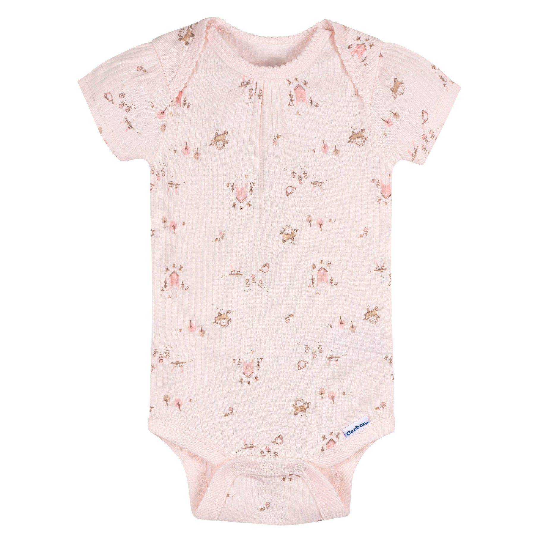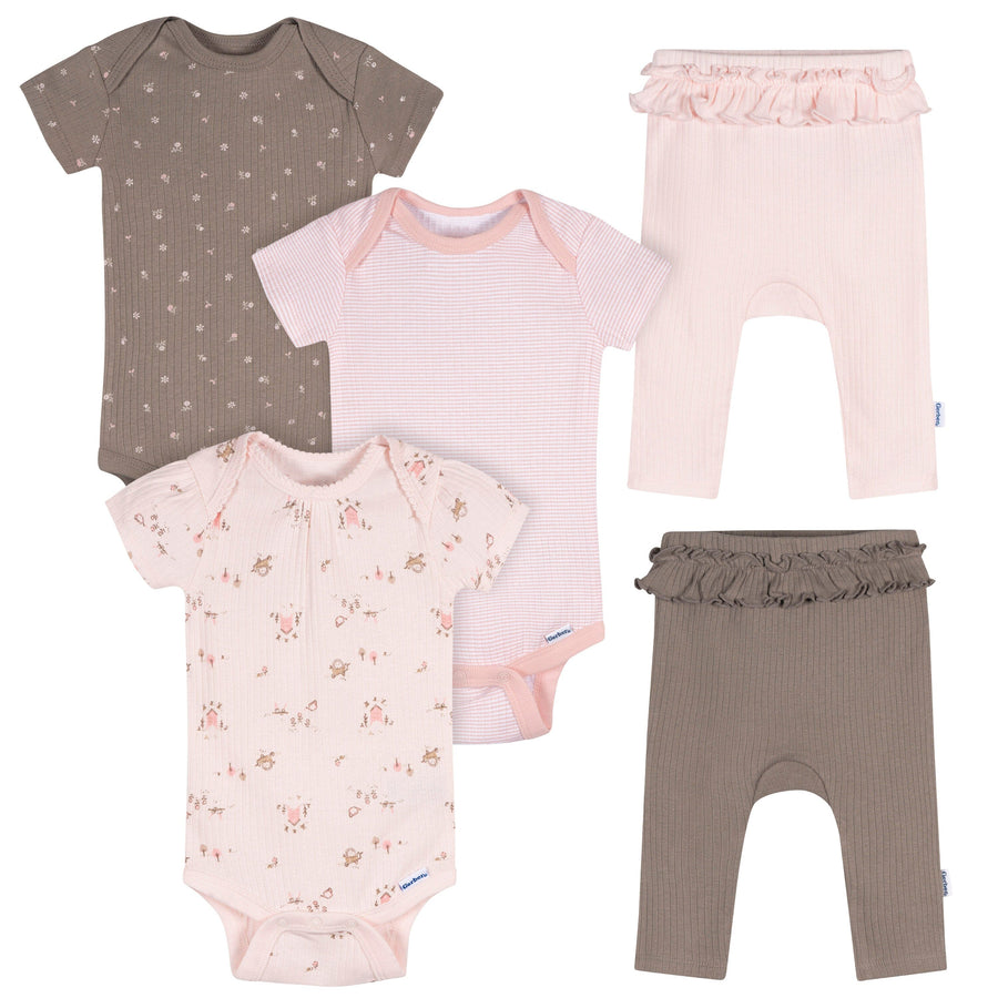 This sweet and practical 5-piece set for baby girls is a must-have for every wardrobe. Made from 100% cotton, the bodysuits and pants are soft and breathable, making them gentle on delicate skin. The lap shoulder neckline and snap closures on the bodysuits make dressing and diaper changes quick and hassle-free, while the pants feature a comfort-stretch waistband for a secure, cozy fit. Cinched ankle cuffs keep the pants in place, ensuring warmth and comfort all day long. With three bodysuits and two pairs of pants, this set is perfect for mixing and matching for any occasion. And it’s made with Better Cotton™, supporting sustainable farming practices for a healthier planet. Our essentials have been independently certified with STANDARD 100 by OEKO-TEX® so that you don’t have to worry about harmful substances in your little one’s wardrobe. Pack includes three bodysuits with two matching pants.