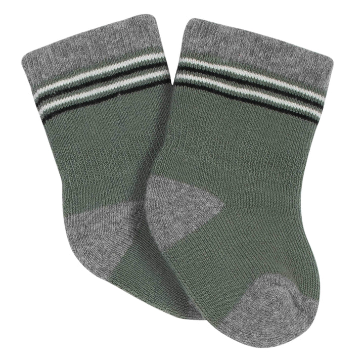 These baby socks are sure to be a favorite! This pack includes six pairs of baby boy socks. Each sock is made with a blended fabric comprised of cotton, nylon, and spandex. This fabric is wonderfully stretchy, which makes getting these socks on and taking them off simple and easy. The blended fabric also is comfortable against baby’s soft and delicate skin. We had this product independently certified with STANDARD 100 by OEKO-TEX® so that you don’t have to worry about harmful substances in your baby’s clothing. These baby socks feature Wiggle-Proof® technology that keeps them held comfortably in place without leaving marks. The soft and cushy socks stay right where they ought to be, on baby’s feet! The socks are made with deep heel pockets to fit baby comfortably and to help them stay on baby’s feet. Gerber® strives to make quality products that parents can trust to bring their children comfort and style.