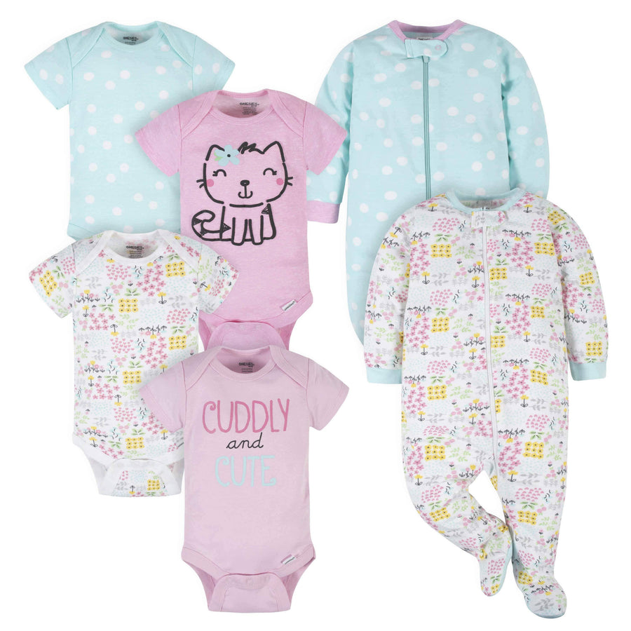 6-Piece Baby Girls Cuddly & Cat Onesies® Brand Bodysuit & Sleep N' Play Set