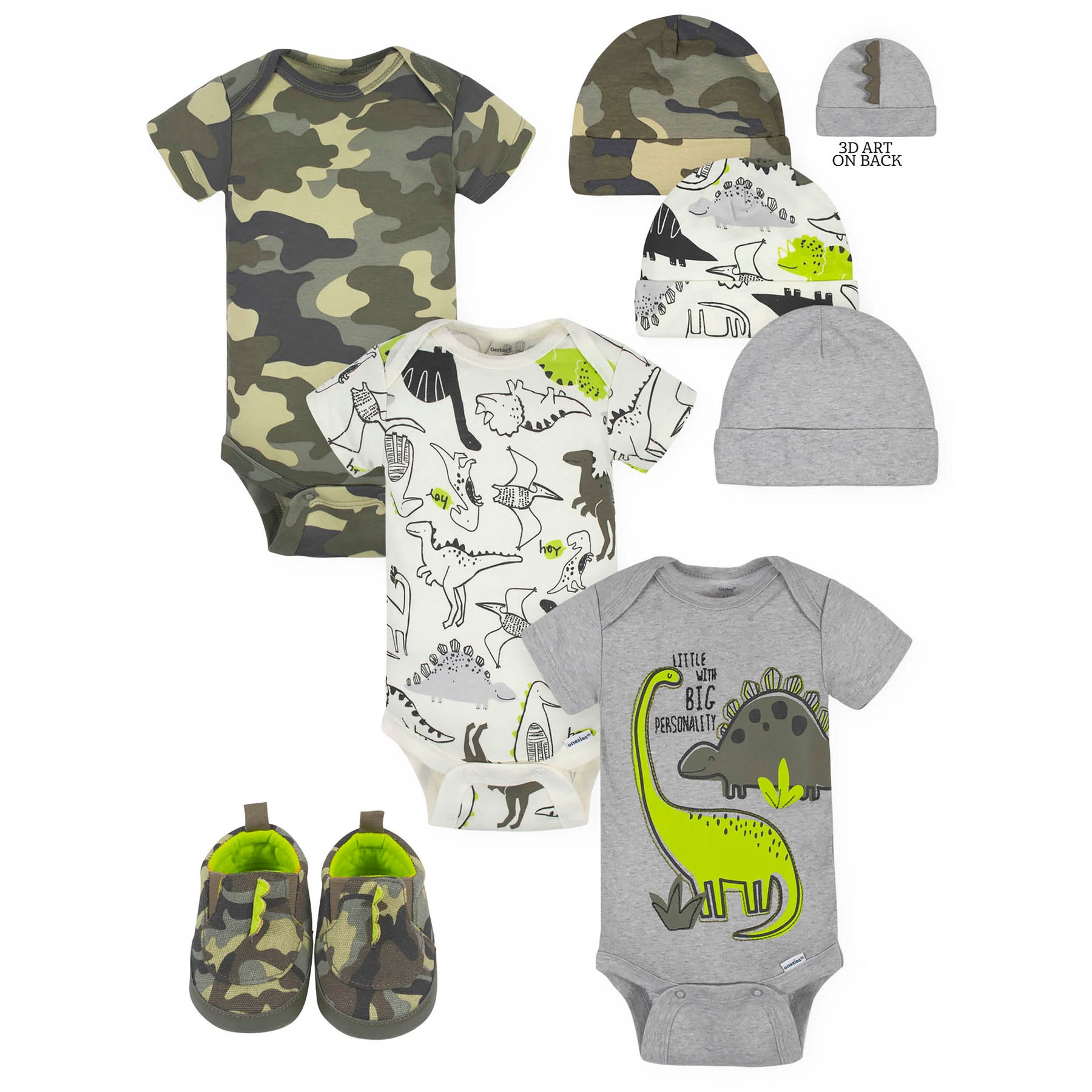 Stock up on the essentials with our Onesies® bodysuits, caps, and shoes sets! Each piece of clothing is made with cotton, a super soft fabric that you and your little one will adore. We had this product independently certified with STANDARD 100 by OEKO-TEX® so that you don’t have to worry about harmful substances in your baby’s everyday essentials. Each Onesies® bodysuit features an expandable lap shoulder neckline and high-positioned bottom snaps for quick diaper changes. The caps feature a soft cuff that ensure a snug, warm fit. The shoes are made of a comfortable canvas and feature a non-skid design. This dino themed set includes three Onesies® bodysuits, three caps, and one pair of shoes.