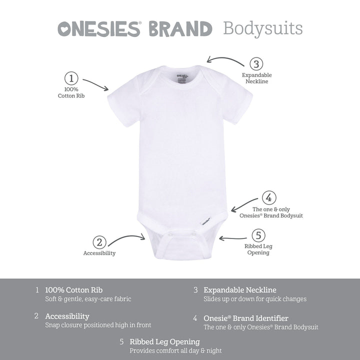 This multipack set of eight short sleeve baby boy Onesies® bodysuits is the perfect go-to for warm weather days! Made from 100% cotton, these bodysuits are gentle on delicate skin, ensuring your little one feels cozy and comfortable all day long. With bright, vibrant colors and fun screenprint art, these bodysuits are easy to mix and match, making dressing a breeze. The expandable lap-shoulder neckline and simple leg snaps make diaper changes quick and easy. Comfort-stretch ribbing at the neckline and leg holes provides a flexible fit that moves with your baby. These bodysuits are essential for any baby boy’s wardrobe and make a fantastic baby shower gift! Our essentials have been independently certified with STANDARD 100 by OEKO-TEX® so that you don’t have to worry about harmful substances in your wardrobe. Pack includes 8 bodysuits.