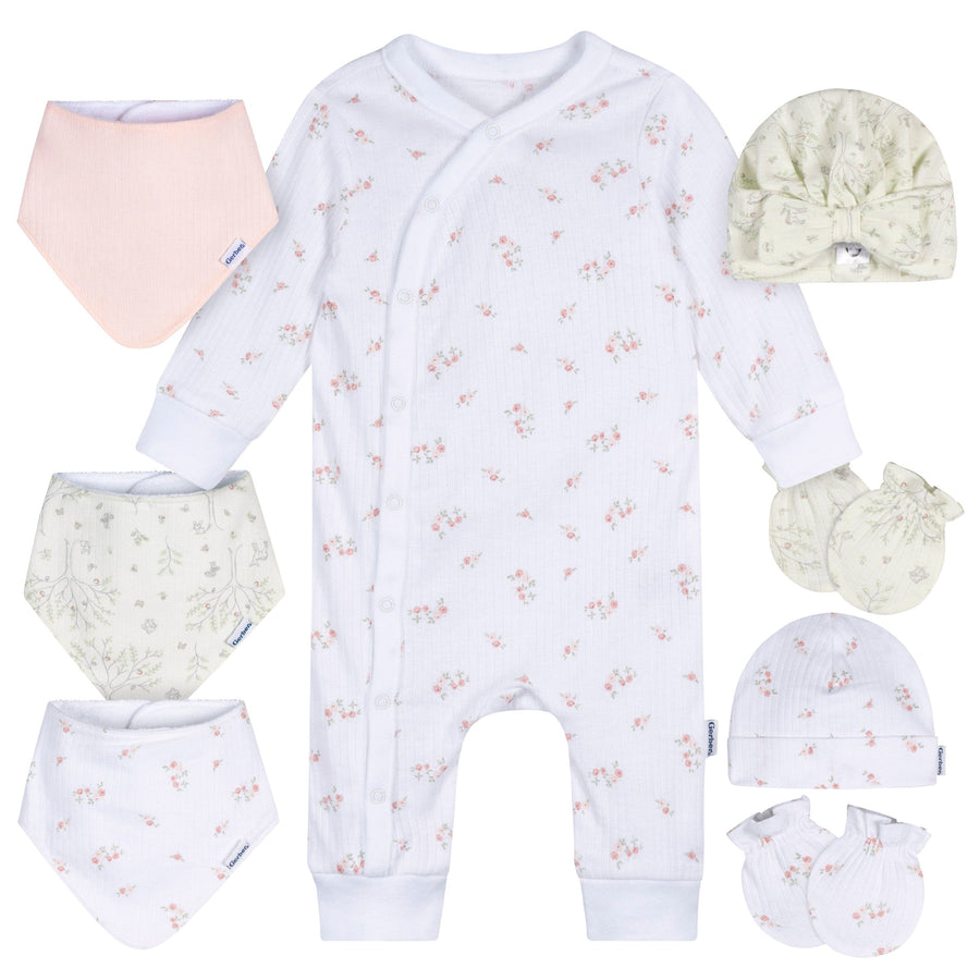 - Includes one footless pajama, three bandana bibs, two caps, and two mittens