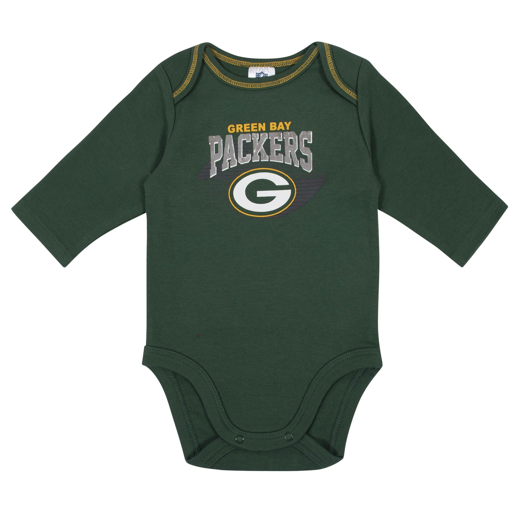 Get your little boy ready to take the field with this baby boys' officially licensed Green Bay Packers long sleeve bodysuit 2-pack set! Gridiron-inspired screenprint with contrast coverstitch frames the Packers logo to perfection. The cotton/poly blend interlock ensures he's feeling his best from the opening kickoff to the final seconds of the game. An expandable lap shoulder neckline makes it easy for mom to dress him out on game days. A higher-in-the-front bottom snap closure simplifies diaper duty. Laundry day stays hassle-free with these easy care items!