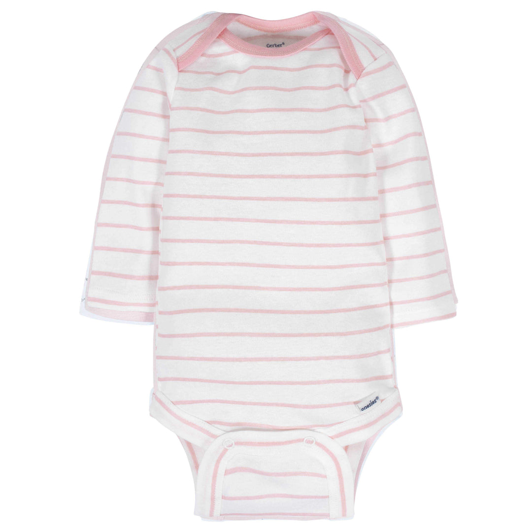 These baby girls long sleeve Onesies® bodysuits are the perfect starters for adorable outfits! This set includes six bodysuits. They're perfect to mix and match with her favorite pants, caps, and accessories to create fun and unique outfits. Each bodysuit is made with cotton to provide comfort and breathability. Such cotton fabric is perfect against babys delicate skin. The Onesies® bodysuits feature an expandable lap shoulder neckline that keeps wardrobe changes at their simplest. The bottom snap enclosure is positioned higher in the front to increase the ease with which diapers may be changed. These baby girls bodysuits are machine washable and dryable to keep laundry day a breeze. This set makes a thoughtful gift for any baby girl you know and love. Its sure to be appreciated by both baby and parents alike. Perfect for layering or worn all on their own, these bodysuits are a great addition to her wardrobe.