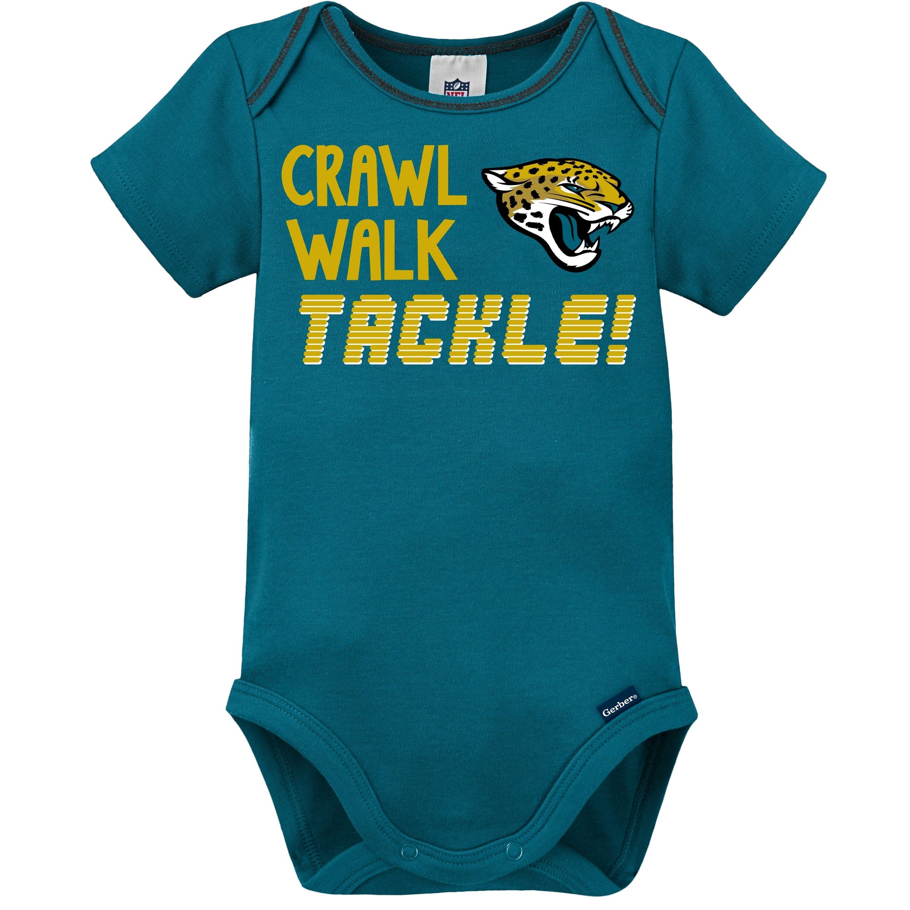 Prepare your little pint-sized all star for game day with this Jacksonville Jaguars baby boys' short sleeve bodysuit 3-pack set! The screenprint with puff and contrast coverstitch details proudly highlights the Jaguars logo. There will be no doubt about who your little boy is rooting for! The cotton/poly blend interlock provides a soft, comfy feel that keeps him at the top of his game as he represents your family's favorite team. An expandable lap shoulder neckline makes pulling the bodysuit over his head easy. The bodysuit's higher-in-the-front bottom snap closure keeps diaper duty simple. These items are easy to clean with the machine wash and dry fabric!
