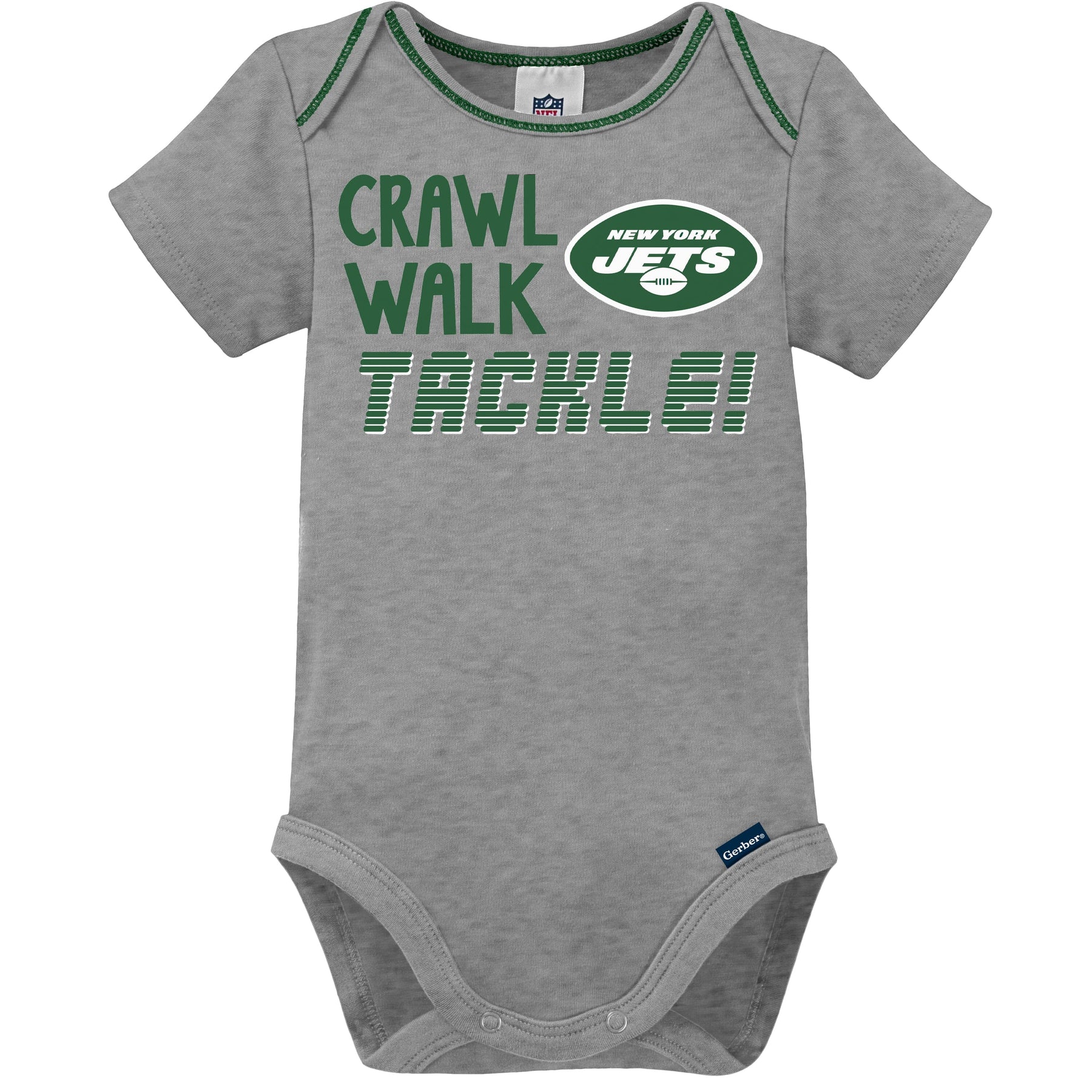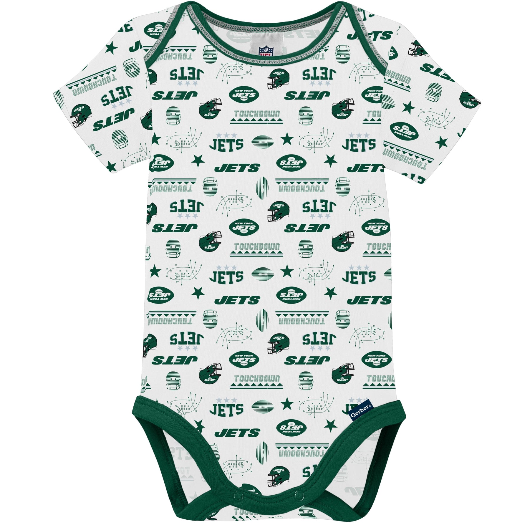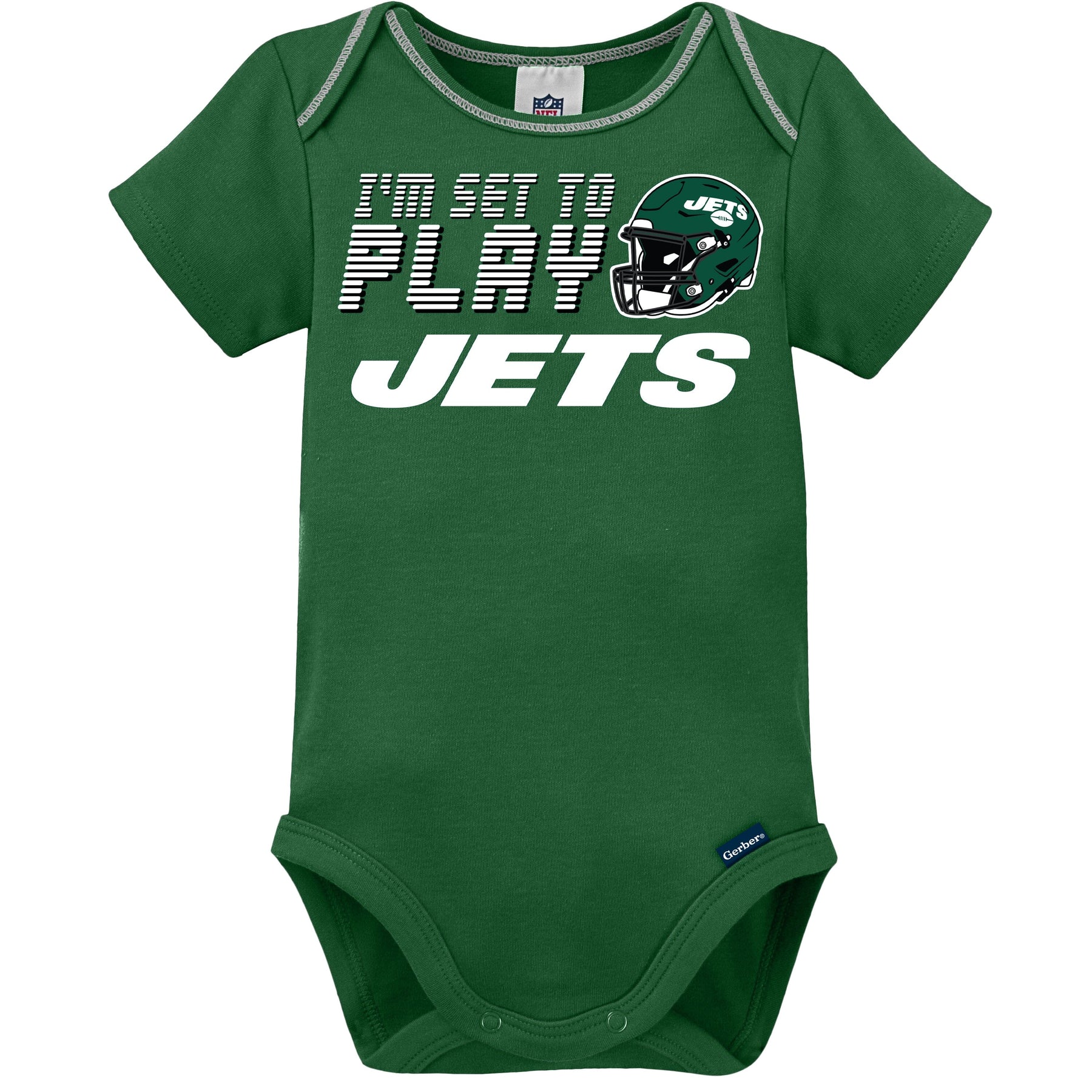Prepare your little pint-sized all star for game day with this New York Jets baby boys' short sleeve bodysuit 3-pack set! The screenprint with puff and contrast coverstitch details proudly highlights the Jets logo. There will be no doubt about who your little boy is rooting for! The cotton/poly blend interlock provides a soft, comfy feel that keeps him at the top of his game as he represents your family's favorite team. An expandable lap shoulder neckline makes pulling the bodysuit over his head easy for mom. The bodysuit's higher-in-the-front bottom snap closure keeps diaper duty simple. These items are easy to clean with the machine wash and dry fabric!