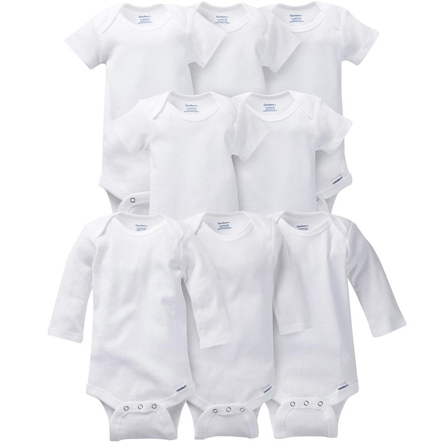 Stay prepared no matter what the season with this 8-pack of white Gerber Onesies® brand short sleeve and long sleeve bodysuits! This collection contains three long sleeve and five short-sleeve bodysuits. The neutral color makes these bodysuits ideal for use as a cozy underlayer when added warmth is needed or for wearing on their own. Each item is made from a soft, breathable 100% cotton rib that will keep your little one comfortable. Convenience-first features like a bottom snap closure that's situated higher in the front makes diaper duty easier. The lap shoulder neckline expands easily for quicker dressing. Laundering these items is easy with the machine wash and dry fabric. Just toss them into the washer and dryer for fuss-free cleaning. Pick up a set today so you'll stay well-supplied with this must-have item for little ones!